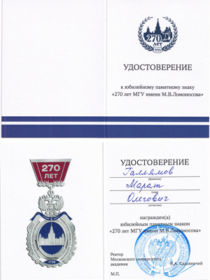 Jubilee badge for the 270th anniversary of Moscow State University (M.V. Lomonosov Moscow State University)